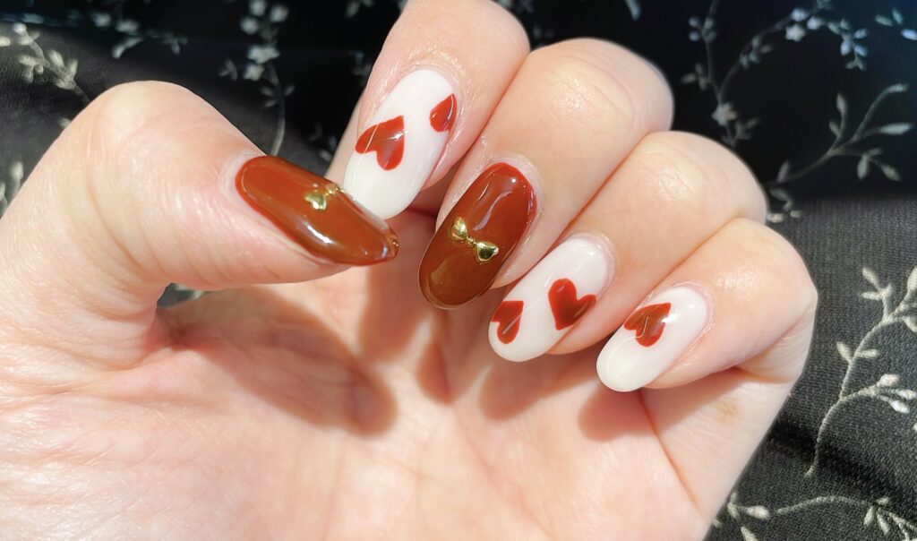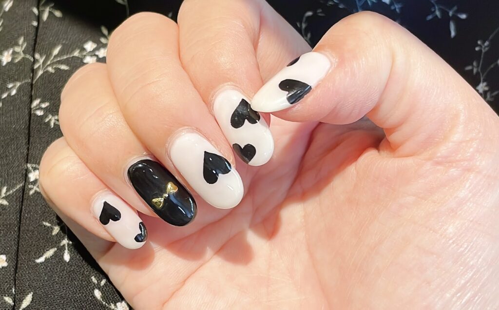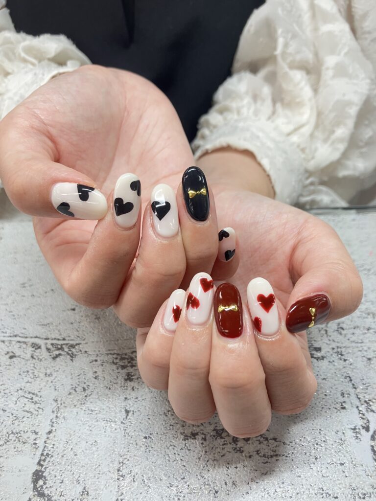 白地に赤、白地に黒のハートデザインってかわいいよなぁ…とふと思い、左右で分けて両方実現していただきました。結果、図らずもトランプ風のネイルデザインに😳