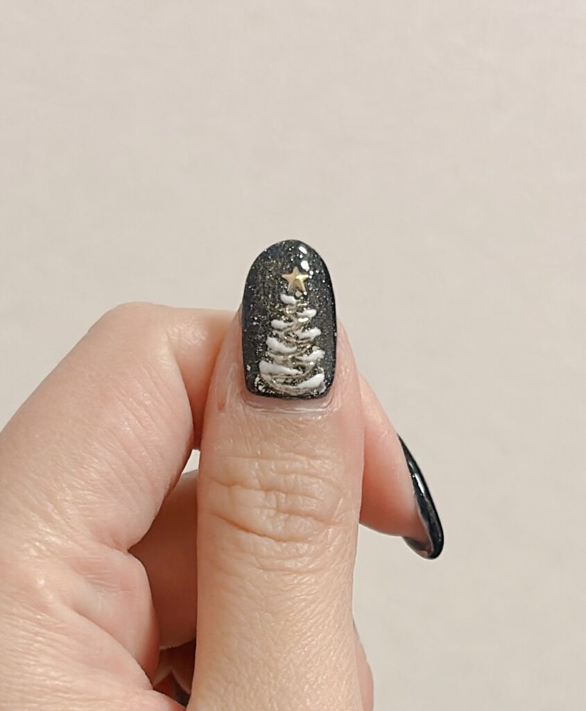 ですが前述のとおり、最近はエレガント志向が強くなり、もっと洗練された大人っぽいネイルにしたい…と思うように。でもクリスマス感はやっぱり出したいので、今回はネイビーをベースに、クリスマスツリーを入れたシンプルめのデザインにしていただくことにしました。