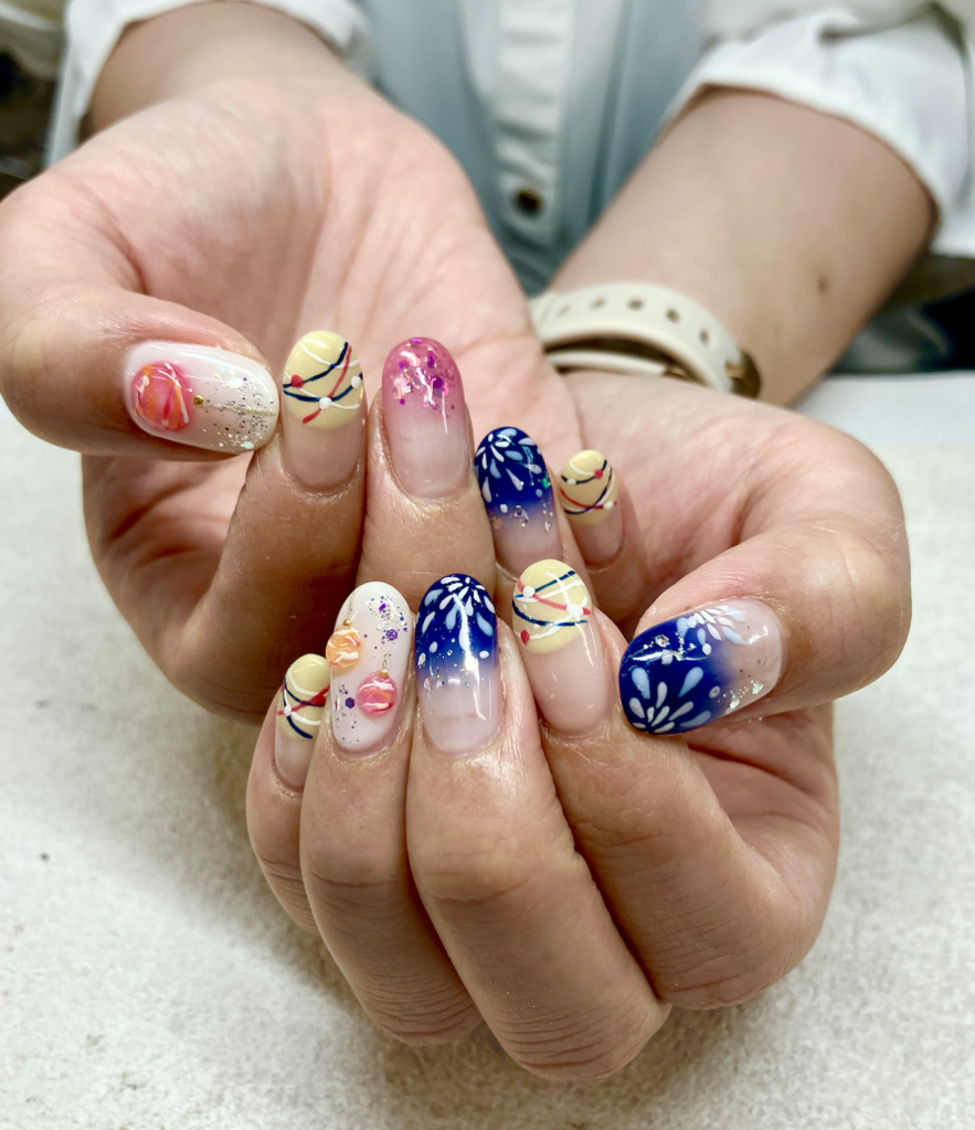 この時期は毎年ヨーヨーをモチーフにしたネイルをお願いするのですが、今年はがっつり花火と組み合わせて夏祭り感を出していただきました。